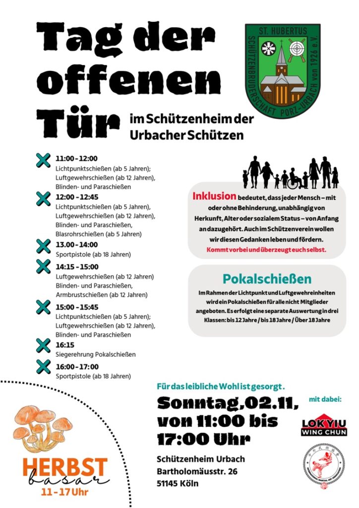 Parallel dazu wird erstmals ein Tag der offenen Tür im Vereinsheim durchgeführt. Über den Tag verteilt werden hier die unterschiedlichen Schießsportangebote der Schützenbruderschaft vorgestellt. Ausprobiert werden können unter anderem das Luftgewehr-, Armbrust- und Lichtpunktschießen (ab 5 Jahren). Im Rahmen der Lichtpunkt- und Luftgewehreinheiten wird für alle Interessierten ein Pokalschießen durchgeführt. Für das Schießen mit dem Luftgewehr werden außerdem die inklusiven Möglichkeiten zum Blinden- sowie Paraschießen angeboten. Hinzu kommen das Schießen mit der Sportpistole (ab 18 Jahren) sowie Blasrohrschießen.