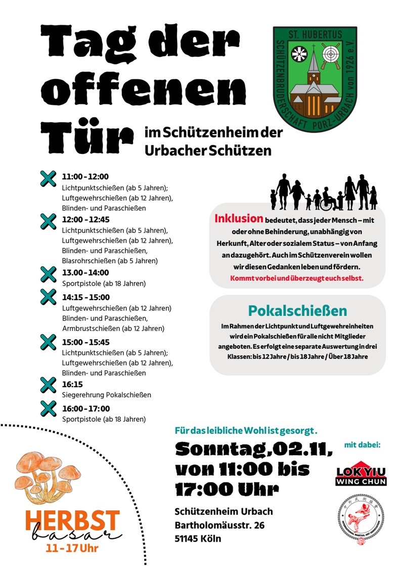 Parallel dazu wird erstmals ein Tag der offenen Tür im Vereinsheim durchgeführt. Über den Tag verteilt werden hier die unterschiedlichen Schießsportangebote der Schützenbruderschaft vorgestellt. Ausprobiert werden können unter anderem das Luftgewehr-, Armbrust- und Lichtpunktschießen (ab 5 Jahren). Im Rahmen der Lichtpunkt- und Luftgewehreinheiten wird für alle Interessierten ein Pokalschießen durchgeführt. Für das Schießen mit dem Luftgewehr werden außerdem die inklusiven Möglichkeiten zum Blinden- sowie Paraschießen angeboten. Hinzu kommen das Schießen mit der Sportpistole (ab 18 Jahren) sowie Blasrohrschießen.